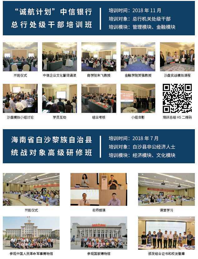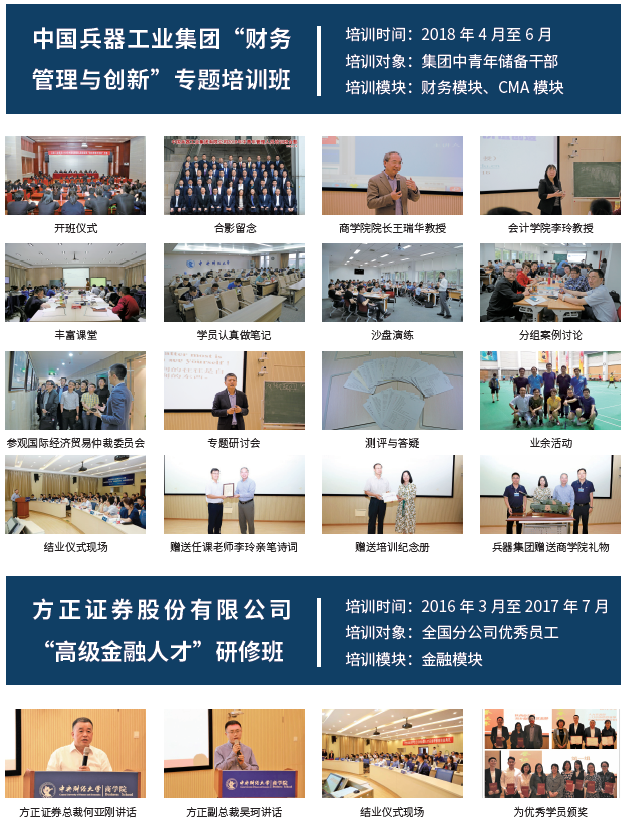近年来,公司举办了各类高级培训班,先后组织承担了中信银行、中国兵器工业集团、海南省白沙黎族自治县统战部和工商联、方正证券股份有限公司、中国邮政储蓄银行天津分行、北京市延庆区、桂林市财政系统、泸州市财政系统等企业和政府的高端财经培训,专门针对政府、企业的人才培养需求量身定制课程,在服务经济建设、社会发展和人才培养方面取得了卓越成效。