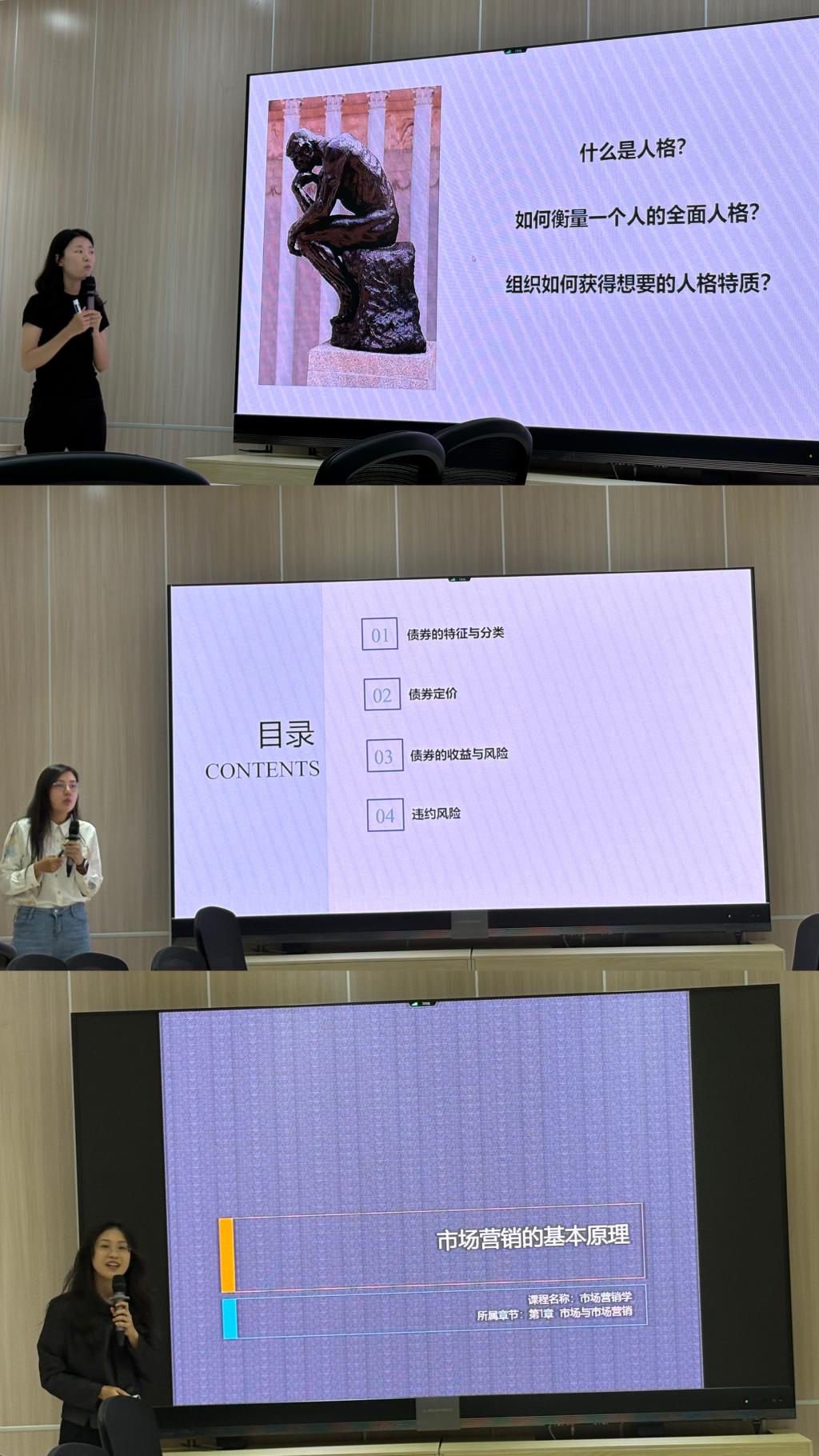 经过各系选拔推荐,组织与人力资源管理系嵇月婷、金融与财务系高震男、市场营销系凌若冰三位青年教师最终入围参赛。大赛邀请了第十三届北京市青年教师教学基本功大赛的优秀指导教师朱飞教授、北京市青年教师教学基本功大赛一等奖获得者李加鹏老师、公司深耕教学一线的资深教师张淑君教授以及公司教学委员会的委员作为评审嘉宾。公司本科项目主任顾雷雷教授担任本次大赛的主持人。
