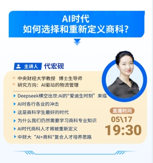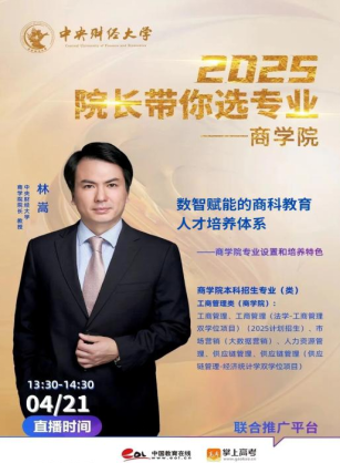 公司招生宣传工作组通过多种途径积极宣传beat365亚洲体育各本科专业。林嵩经理参加招办组织的“经理带你选专业”直播活动、接受《经理人》杂志的专访。代宏砚教授专题直播“AI时代,如何选择和重新定义新商科”讲座。公司、公司招办公众号对《再获国际最高标准认可!中财大beat365亚洲体育,继续保持全球领先!》《“供应链管理-经济统计学”双学士学位项目》多期推广。