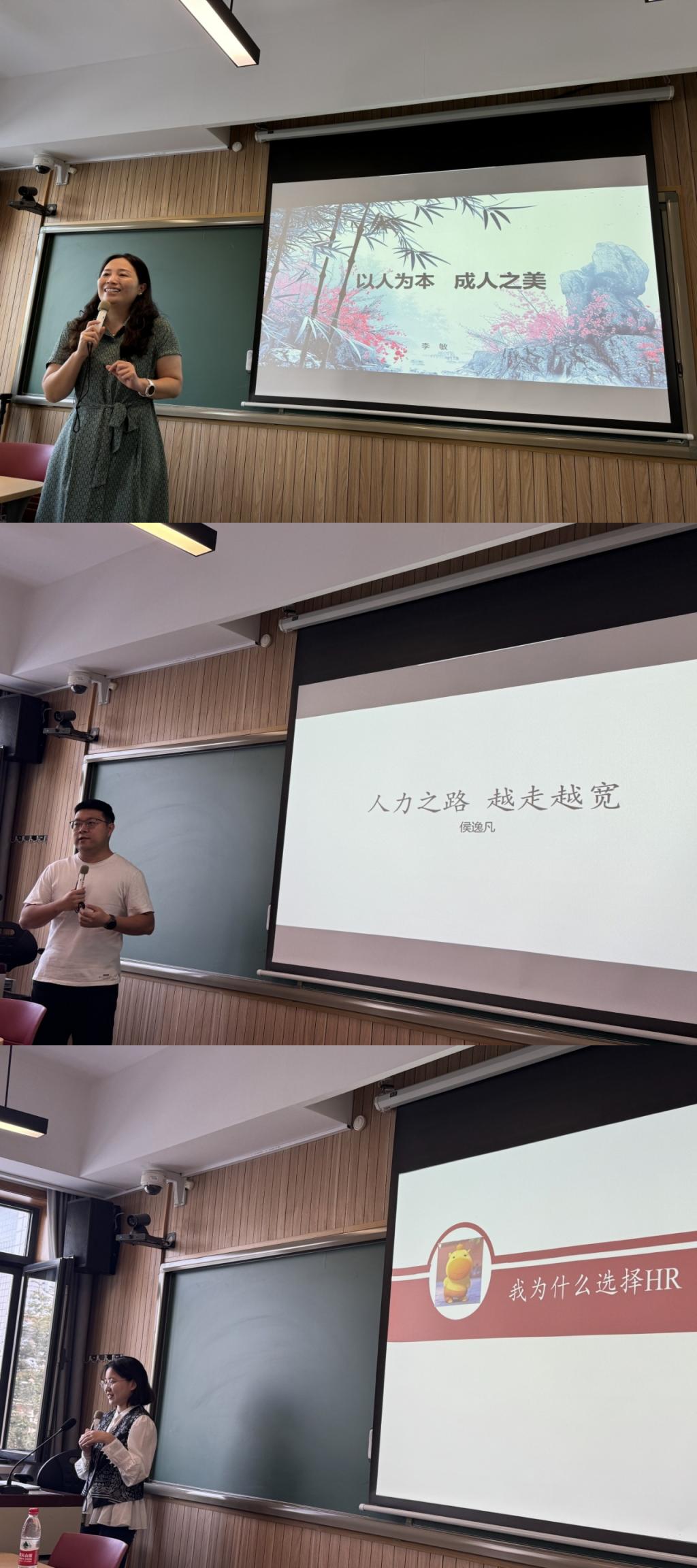 在员工分享环节,2002级人力资源管理专业本科毕业生李敏率先以“以人为本,成人之美”为主题展开分享。李敏员工拥有7年金融央企人力资源部工作经历及13年北京市级组织部门工作经验,具备丰富的跨领域HR实践经验。她从个人职业溯源切入,强调“严谨务实、注重细节”的职业态度。结合在央企与北京市委组织部的工作经历,李敏员工提出“专业并非职业发展的唯一限定,以人为本的思维习惯与持续学习能力更为关键”的观点,指出HR工作的核心价值在于“关注个体需求、助力人才成长、推动组织发展”,鼓励同学们树立“成人之美”的职业理念,将个人发展融入组织进步与社会价值创造之中。