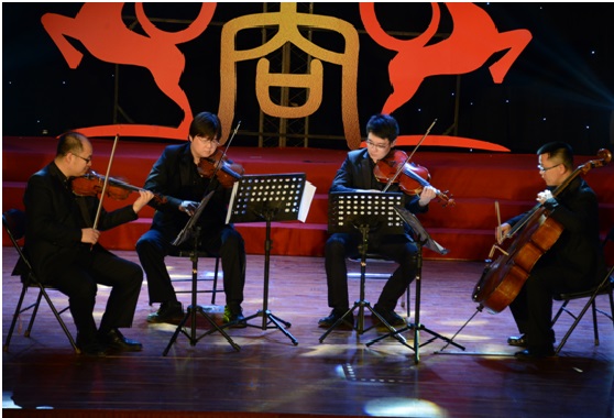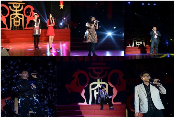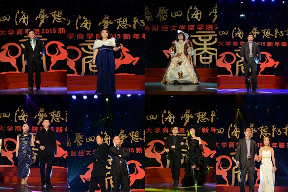 联欢会在MBA员工带来的活力四射、热情洋溢的歌舞《超级英雄》拉开了序幕,热情尚未散去,本科、研究生以及员工、老师轮番上台,用精彩纷呈的歌曲串烧为观众奉上音乐盛宴。诗朗诵《商院人》情深意切,相声《中财新闻联播》诙谐风趣,古典舞蹈《咏春》《桃夭》,惊为天人,美轮美奂;动感T台秀,历届商院员工在动感的乐曲中展现着自信、青春的姿态,为观众送去新年祝福。宛转悠扬的独唱《幸福山歌》、精妙绝伦的弦乐四重奏让观众沉醉其中,员工独唱《改变自己》、《再回首》令人喝彩,回味无穷,爆笑的脱口秀《百家笑谈》、引人入胜的魔术以及舞台剧《中财好声音》更是获得掌声不断、欢笑连连,将现场的气氛推向了高潮。