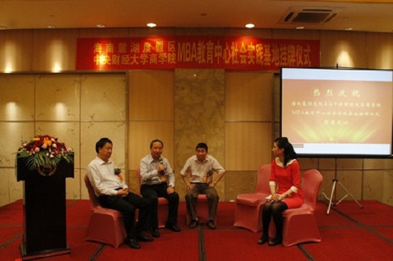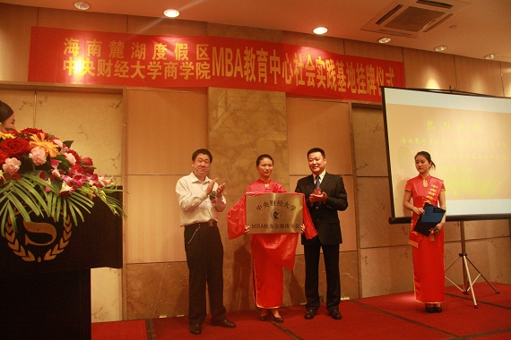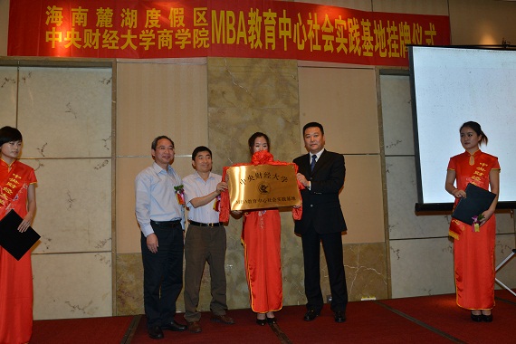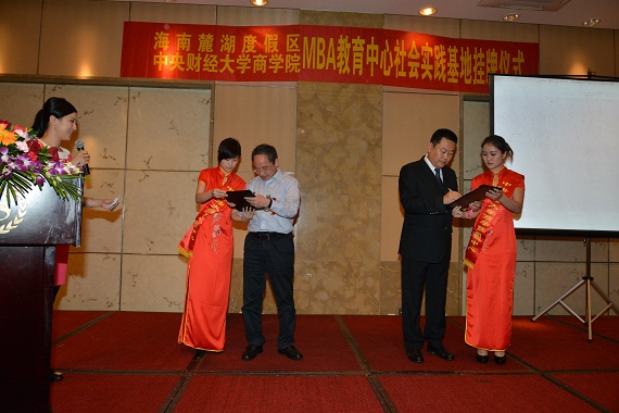 2014年3月29日上午,体育365官网MBA教育中心与中合集团旗下海南麓湖度假区社会实践基地签约暨授牌仪式在海南举行。beat365亚洲体育经理兼MBA教育中心主任王瑞华教授、白沙黎族自治县常务副县长王桂厅、首届MBA员工、中合集团董事长韩涛、白沙黎族自治县副县长卢瑞强、白沙黎族自治县政协副主席孙小旧、中合集团总裁李红勋等出席了本次活动。公司MBA教育中心孔伟明老师、公司员工会会长王再文、MBA员工会会长冯大任、MBA员工理事会理事、秘书处成员及公司员工代表20余人参加了本次活动。