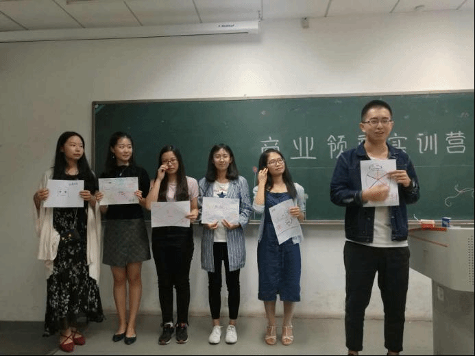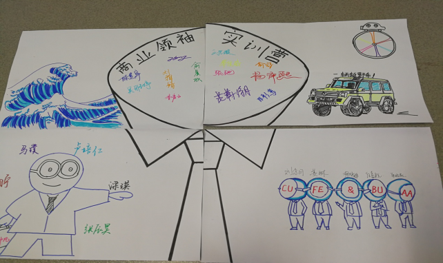 在没有任何指导的情况下,几位有创作想法的同学聚在讲台上把他们的创意画出来,一个巨大的领带象征着商业的气质,符合商业领袖实训营的特色,同时每一组都在其他区域画出了代表自己团队的符号,这些符号成为了最后的点睛之笔。