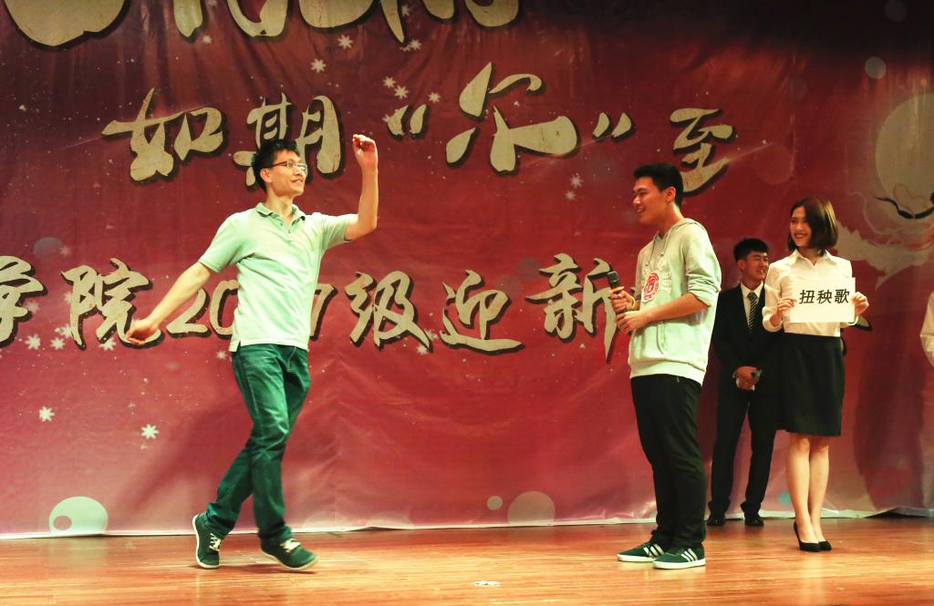 市场营销16班的朗诵歌舞情景剧《萨瓦迪卡》以幽默欢快的形式讲述了“小芳入学记”,引起在场同学的共鸣,欢声笑语洋溢在金厅上空。