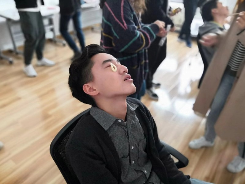 任督二脉瞬间被打通之后,又开始了面部运动,每队选出一人抛坚果并用嘴接住,第二位同学用面部表情将洋葱圈从额头移到嘴边,剩下的人噘嘴夹住一根饼干,第二名同学将洋葱圈套在第三名同学的饼干上,剩下的同学依次传递至指定的位置。