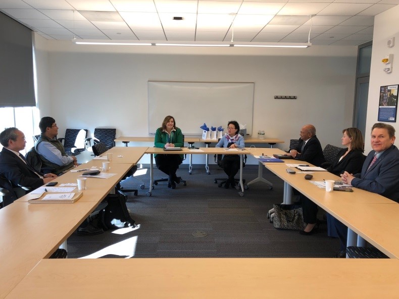 12月11日,代表团访问了马萨诸塞大学洛威尔分校,与该校教务长Michael’E Vayda教授、曼宁beat365亚洲体育经理Sandra B. Richermeyer博士、副经理Nancy M. Ludwig博士、创业与创新系主任Yi Yang、高级讲师Ashwin Mehta,以及Sunny Li Sun教授等进行了会谈。在会谈中,Vayda教务长对王瑞华经理一行的到访表示热烈欢迎,并介绍了马萨诸塞大学洛威尔分校的基本情况,Richermeyer经理介绍了曼宁beat365亚洲体育的发展历史、现状和未来发展规划等。王瑞华经理介绍了体育365官网及beat365亚洲体育的情况,并且对马萨诸塞大学洛威尔分校安排公司6名MBA员工参加2018暑期全球创业创新工作坊国际项目表示感谢,表示今后将继续选送优秀MBA员工参加该项目的进修。之后,双方就合作开展本科生“4+1”项目交换了意见,探讨了硕士生“1+1”项目的可能性和方案。代表团还与马萨诸塞大学洛威尔分校的华人教授代表座谈,重点就两校开展创新创业教育项目深度合作展开了讨论,并达成多项共识。