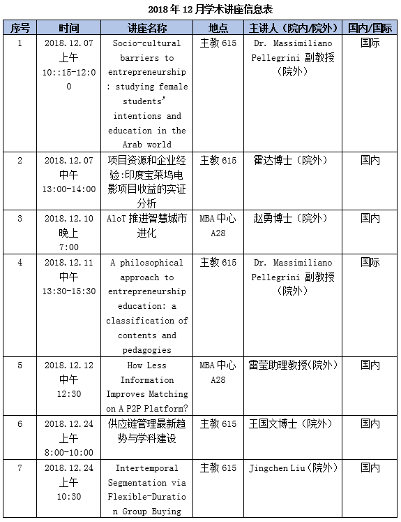 2018年12月,公司教师积极邀请海内外知名学者来校举办讲座,加强内外部学术交流。