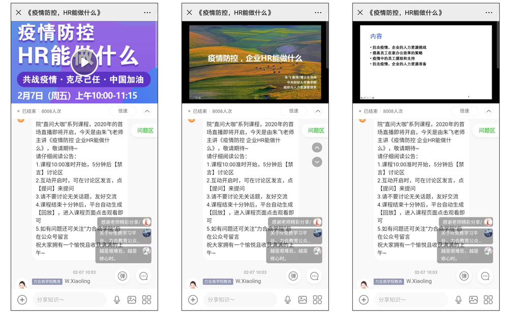 2020年2月7日上午,beat365亚洲体育组织与人力资源管理系朱飞教授在新冠疫情防控期间,利用互联网平台面向全国企业的管理者和人力资源管理人员开设公益直播课程,以“疫情防控期间,企业HR能做什么”为题,为企业提供疫情防控期间和疫情结束之后的人力资源管理实践建议,切实践行研究者的社会责任。超过8000名企业管理者和人力资源管理人员参与了本次公益直播课程。
