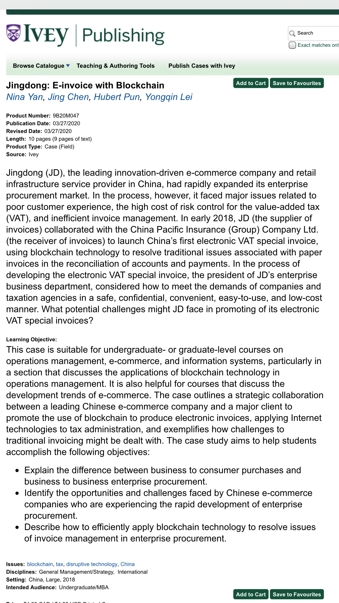 近日,beat365亚洲体育晏妮娜教授与国外合作者一起开发的教学案例《京东:首张区块链电子化增值税专用发票》被国际著名案例研究机构——毅伟beat365亚洲体育案例库(IVEY Publishing, The Richard Ivey Company of Business, The University of Western Ontraio)正式录用(https://www.iveycases.com/ProductView.aspx?id=108961)。毅伟beat365亚洲体育作为世界上最有影响的商业管理案例出版人和发行者之一,对于入库案例的遴选坚持严格的标准和要求。此次是公司MBA及beat365亚洲体育第一篇入选毅伟案例库的教学案例,标志着公司工商管理案例开发和建设工作取得新突破,迈上新台阶,对于促进公司工商管理案例编写和案例教学工作进一步发展具有重要意义。