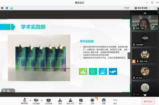 联合会秘书长郑晔为新生介绍了中财MBA员工组织,包括员工联合会、员工兴趣社团与员工会。郑晔学姐特别强调,中财MBA的各个员工组织,面向所有MBA同学,旨在开发校内外资源,搭建资源共享平台,为MBA每一位同学和员工的成长和事业发展助力。