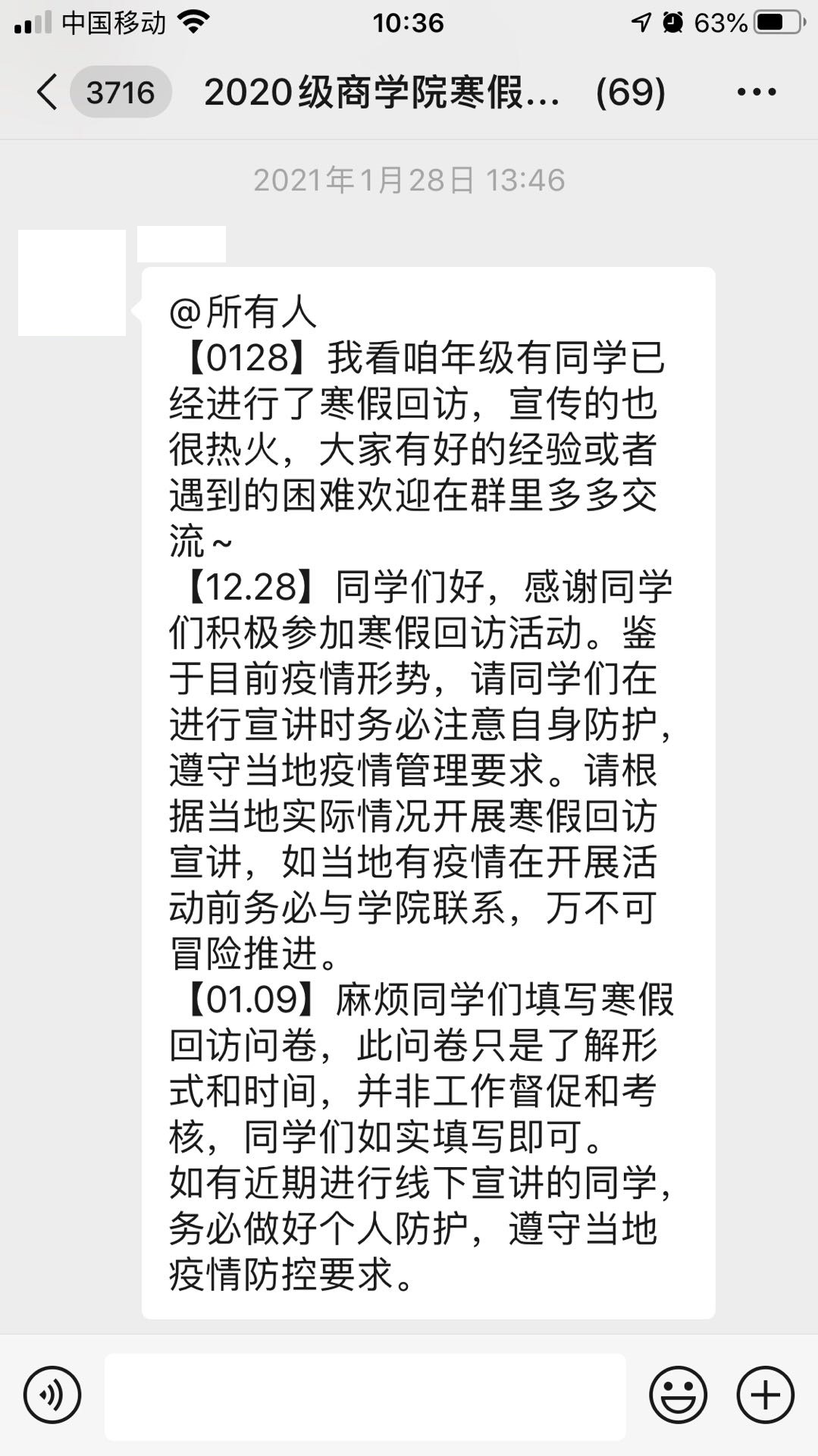 公司分年级组建了寒假回访员工工作群,方便同学们在群内交流经验;通过问卷方式随时了解员工参与回访活动的进度和面临的困难;公司招生宣传工作小组老师和各年级辅导员在群内从内容、形式、安全等多方面指导员工开展回访活动。公司对参加陕西、甘肃两省中学回访的同学给予了高度关注,针对因疫情等原因无法入校回访的情况,公司除帮助员工与中学联系沟通外,还指导员工通过线上直播、视频录播、微信推送等形式开展线上回访;对于已经完成回访活动的员工,公司及时进行沟通交流,从员工反馈进一步了解中学的需求、期待和当地生源情况。这样的跟进指导工作既锻炼了招生宣传的员工队伍,丰富了宣传渠道与模式,为进一步开展本科招生宣传工作打下了良好的基础。