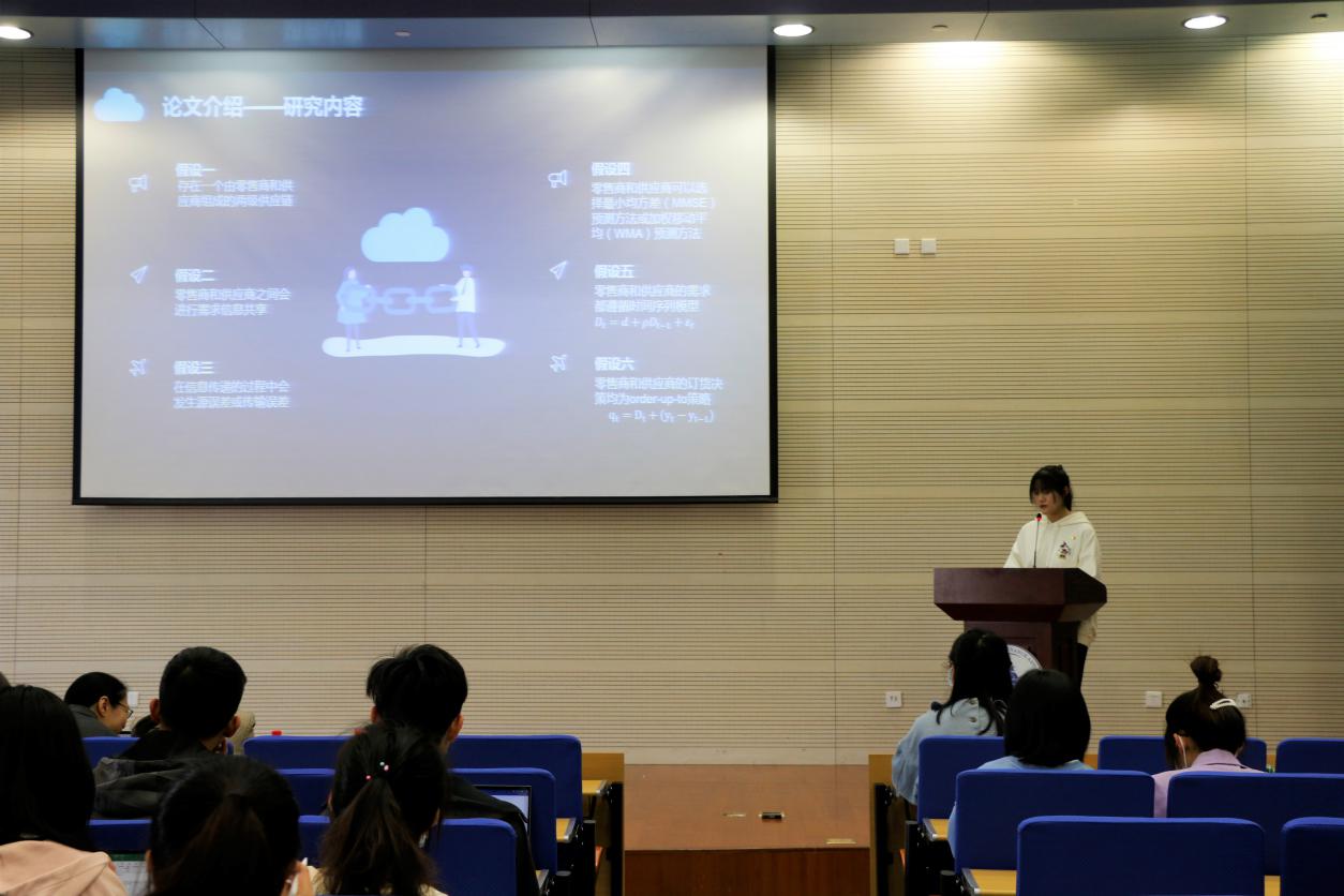 本次大赛本科生组一等奖获得者——物流管理18的熊小溪为同学们进行了优秀论文分享,从选题背景、写作思路、模型分析和研究结果四个方面介绍了自己的论文。同时,熊小溪同学也从耐心、求知欲、思考和探索以及求“新”的角度谈了自己在论文写作中积累下来的经验:学术研究无疑是考验耐心和毅力的事,写论文需要有足够的耐心试错,也要有足够强大的内心推翻重来,慢慢“磨”总会做出一点值得骄傲的成绩。