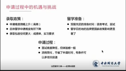 在本次讲座中,张帆员工从入学后的学习和生活、申请过程中的机遇和挑战、如何缓解疫情下的留学焦虑和法国高商留学的优劣势四个方面为大家进行讲解。