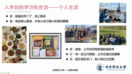 张帆员工从三方面介绍留学期间的学习和生活。首先,他对留学国家和公司的防疫政策进行简要说明。其次,张帆员工对于大家普遍关心的课程学习方式进行了介绍,对比了线上学习的优劣势。他认为,疫情期间留学的确有一些缺点,尤其体现在线上教学方面。但是线上环节也有一定的优点,如提供更快捷的合作模式、充足的空闲时间、更丰富的教学资源等。随后,张帆员工就个人生活的“衣”“食”“住”“行”“乐”五个方面进行了分享,为大家详细介绍了疫情期间特殊的法国职工活。