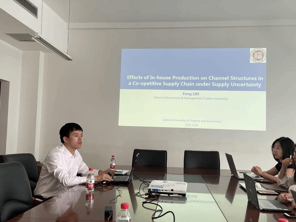 供应链与运营管理系卢继周老师主持并介绍了林峰老师的履历。林峰老师是西安交通大学博士和香港城市大学博士(联合培养),目前是福州大学经济及管理公司讲师,硕士生导师,入选福州大学“旗山学者”(海外项目)奖励支持计划。主要从事供应链金融下运作管理、跨境供应链下竞合决策等领域研究。已在Omega,OR Society,CIE,EJOR、运筹与管理等国内外知名期刊发表论文15篇。