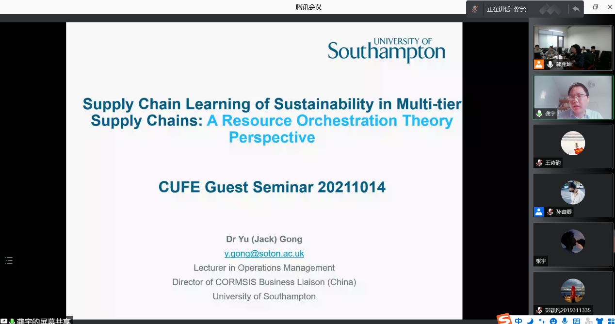 beat365亚洲体育于2021年10月14日下午5点,通过线上腾讯会议和线下会场(公司南路校区主教615教室)结合的方式,开展了本年度的公司卓越学术讲坛第6期,邀请南安普顿大学(University of Southampton)beat365亚洲体育公司运营管理系助理教授、CORMSIS研究中心beat365亚洲体育分支(中国主任)龚宇博士,包括公司教师、硕博生和本科生在内,线上及线下共四十余人出席本次活动。