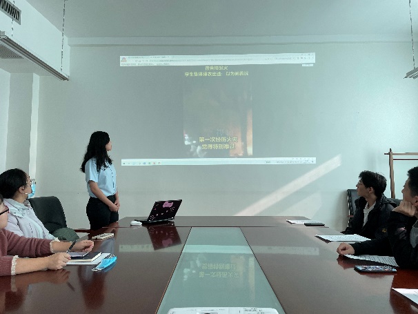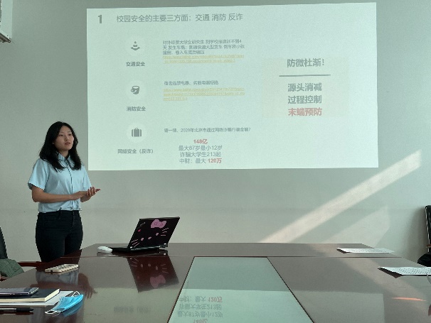 赵柏澜同学介绍了本次培训目的:重视员工安全委员职务,明确岗位职能。培训从“明确校园安全内涵”“分享个人在公司安全教育协会工作的经历和经验”“明确安全委员职责”三个部分展开。赵柏澜同学重点为大家讲解了交通、消防、反诈等校园安全重要工作,层次分明、逻辑清晰,并结合实际案例、新闻视频以及个人经历生动形象地说明了做好校园安全工作的重要性,希望安全委员正确认识、高度重视安全工作,将这份责任作为一项长期事业来对待,积极发现身边的安全隐患,认真督促同学们规避生活中的不安全行为。