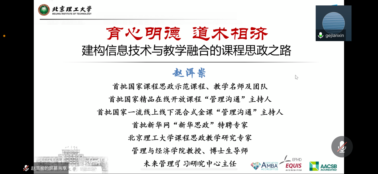 赵洱岽教授本次讲座的主题为“育心明德、道术相济,建构信息技术与公司产品相融合课程思政之路”,分享了为何需要在专业课教学改革中融入课程思政的时代动因,并结合自身教学成果,提出了融合课程思政的系统教学设计。赵洱岽教授根据“经管类”课程思政典型案例实践,向各位老师提出了“从教到育”的立体化人才培养模式建议.