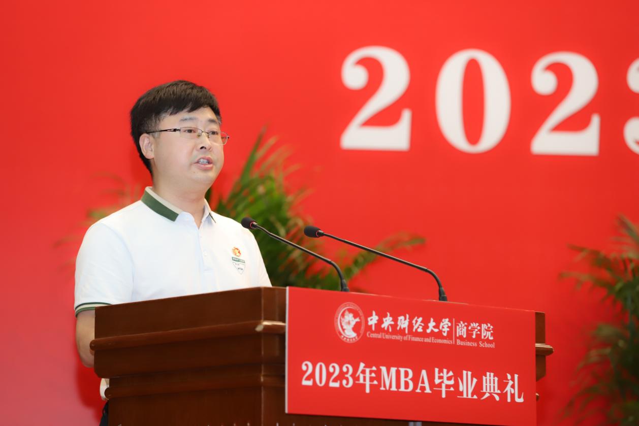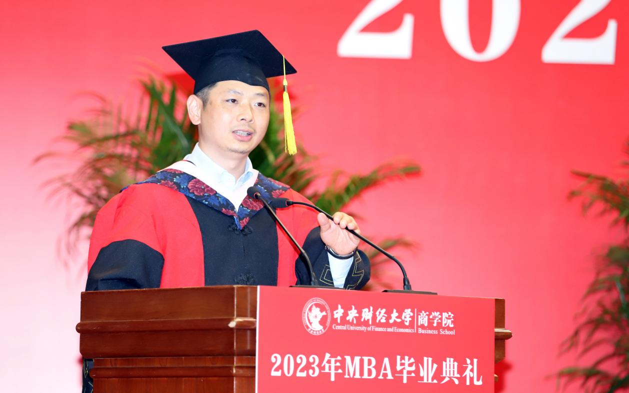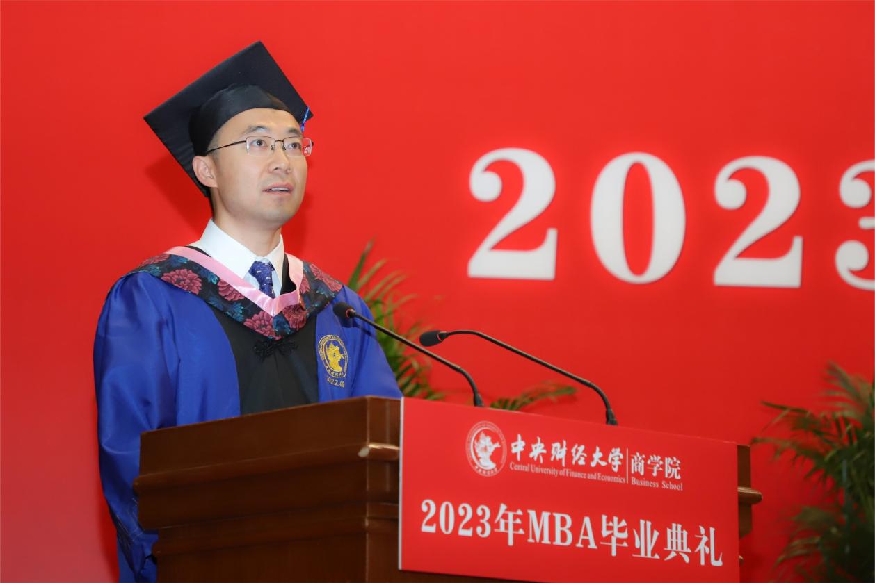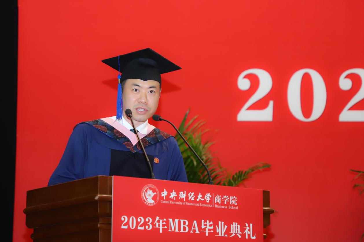 MBA任课教师于晓东作为教师代表发言,并向毕业生们献上真诚的祝福。他表示,非常高兴能代表公司全体MBA授课教师参加同学们的毕业典礼,见证大家毕业的喜悦,祝贺大家满满的收获,展望每个人美好的未来。他谈到,毕业为大家穿梭于工作岗位和公司课堂之间的辛劳和周折画上句号,也为大家开启了更高学位之下新阶段的开始和更高的目标与未来。于老师基于beat365亚洲体育的“商”字 的架构,将对大家的期望与祝福也浓缩在一个“商”字中。“商”的上半部分的“立”,于老师引用《左传》里的“太上有立德,其次有立功,其次有立‘’,期望大家在今后的工作中和生活中,从立德到立功再到立言,都不能放松对自己的要求。“商”字的下半部分“冏”,于老师赋予了炯炯有神和代表光明的内涵,以此祝愿广大毕业生前景光明,祝愿我们的国家拥有光明的未来。