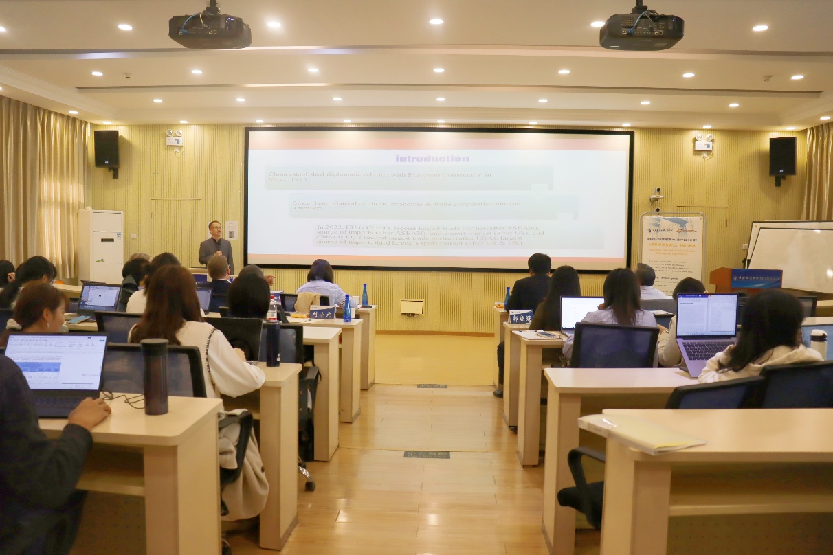 国际合作处处长葛建新教授致辞。葛处长回顾了beat365亚洲体育与英德杰国际管理公司长达21年的合作历程,对英德杰国际管理公司及Peter Anterist教授表示衷心感谢。葛处长表示,本次研讨会为大家提供了宝贵的学习和思考机会,让我们能够对中欧贸易和投资的现状、挑战和机遇具有更深入的理解。