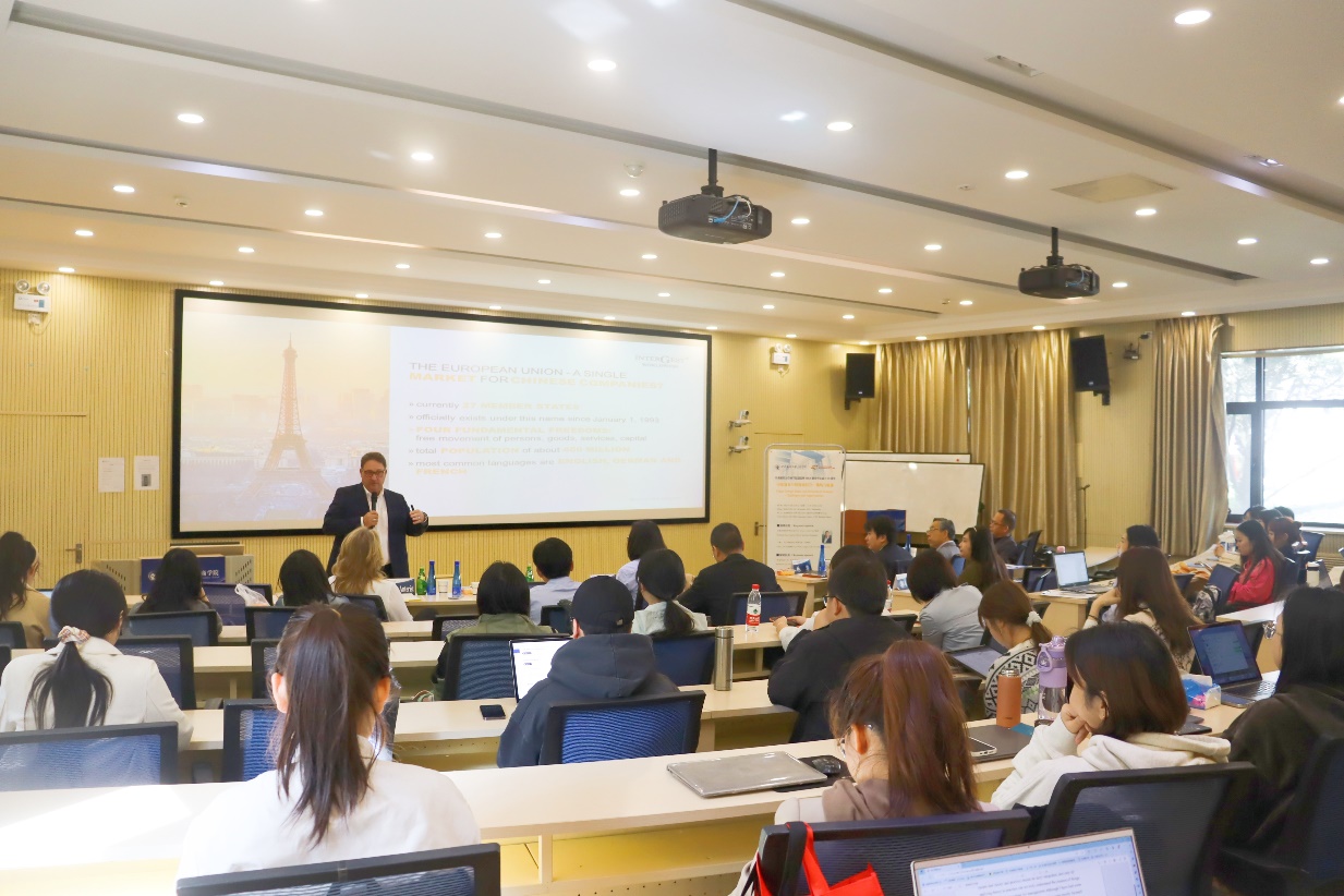 在主旨演讲环节中,首先由Peter Anterist教授发言。Peter Anterist教授系英德杰国际管理公司(InterGest Worldwide)CEO、体育365官网客座教授,其领导的英德杰国际管理公司致力于为国际优质跨国公司提供服务,帮助其建立和管理海外分支机构。Peter Anterist教授以“The European Union- a single market for Chinese companies?”为主题展开,从增值税、最高收入、劳动成本等方面详细介绍并阐述了欧盟内部不同国家的制度和规则差异,并从财政和经济角度说明了欧盟国家的差异性,使同学们对于欧盟国家有了更加深入的认识。