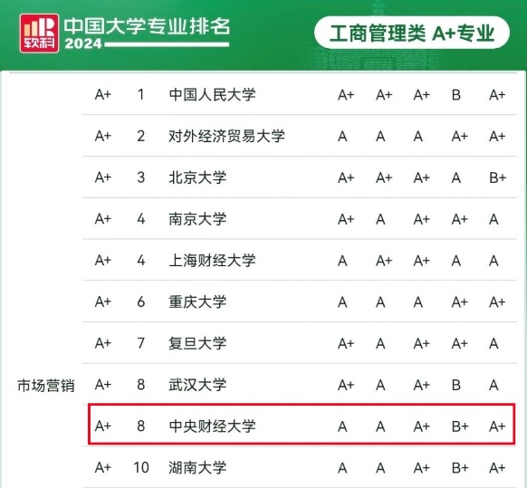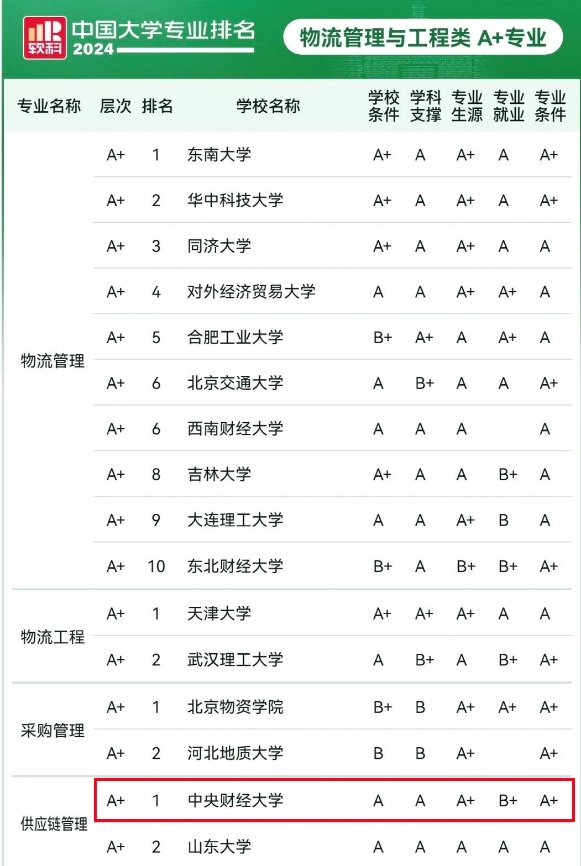 公司市场营销专业和供应链管理专业均获得A+等级,且供应链管理专业位列A+层次第一名。同时,工商管理和人力资源管理也均获得A等级。