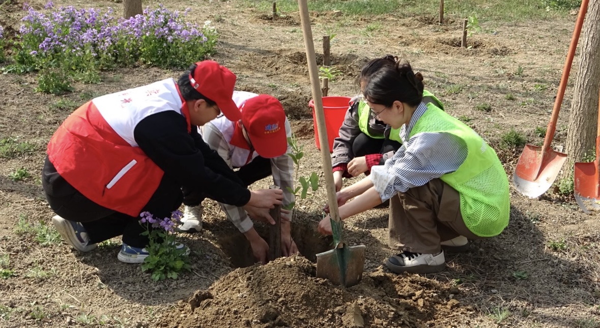 “一锹土,一份情;一棵苗,一份责。”到达基地后,专业园林师傅的现场教学,将生态理念转化为可触摸的行动指南。在专业园林师傅的指导下,同学们分组展开义务植树劳动。挖坑、取苗、植苗、绑桩、埋坑、浇水……每一步都一丝不苟,井然有序。