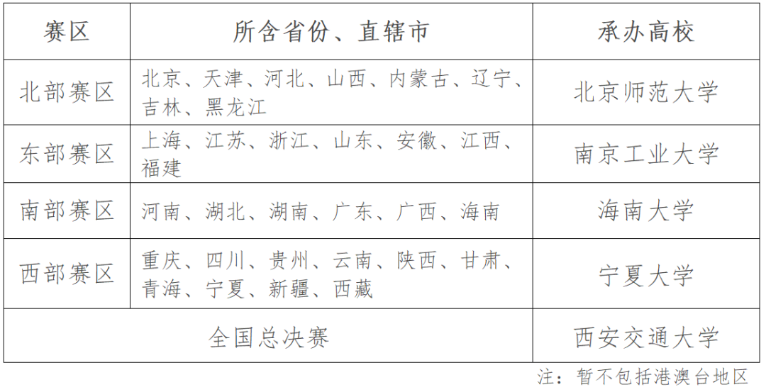 大赛分为四大赛区,各个赛区的划分如下表所示: