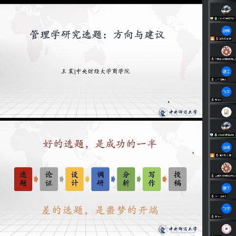 7月22日下午,夏令营首先开展了笔试考核。笔试按照严格的流程进行,开考前对考生身份及考场环境进行检查,考试全程采取双机位进行监考。笔试之后,由组织与人力资源管理系主任王震教授以《管理学研究选题:方向与建议》为营员带来一场关于研究选题的精彩讲座。王震教授根据自己多年从事管理学研究的经验,从什么是好的选题、好的选题从哪里来、选题的一般步骤、选题的典型方向等角度,为营员总结出一套关于管理学研究选题的“独家秘笈”。
