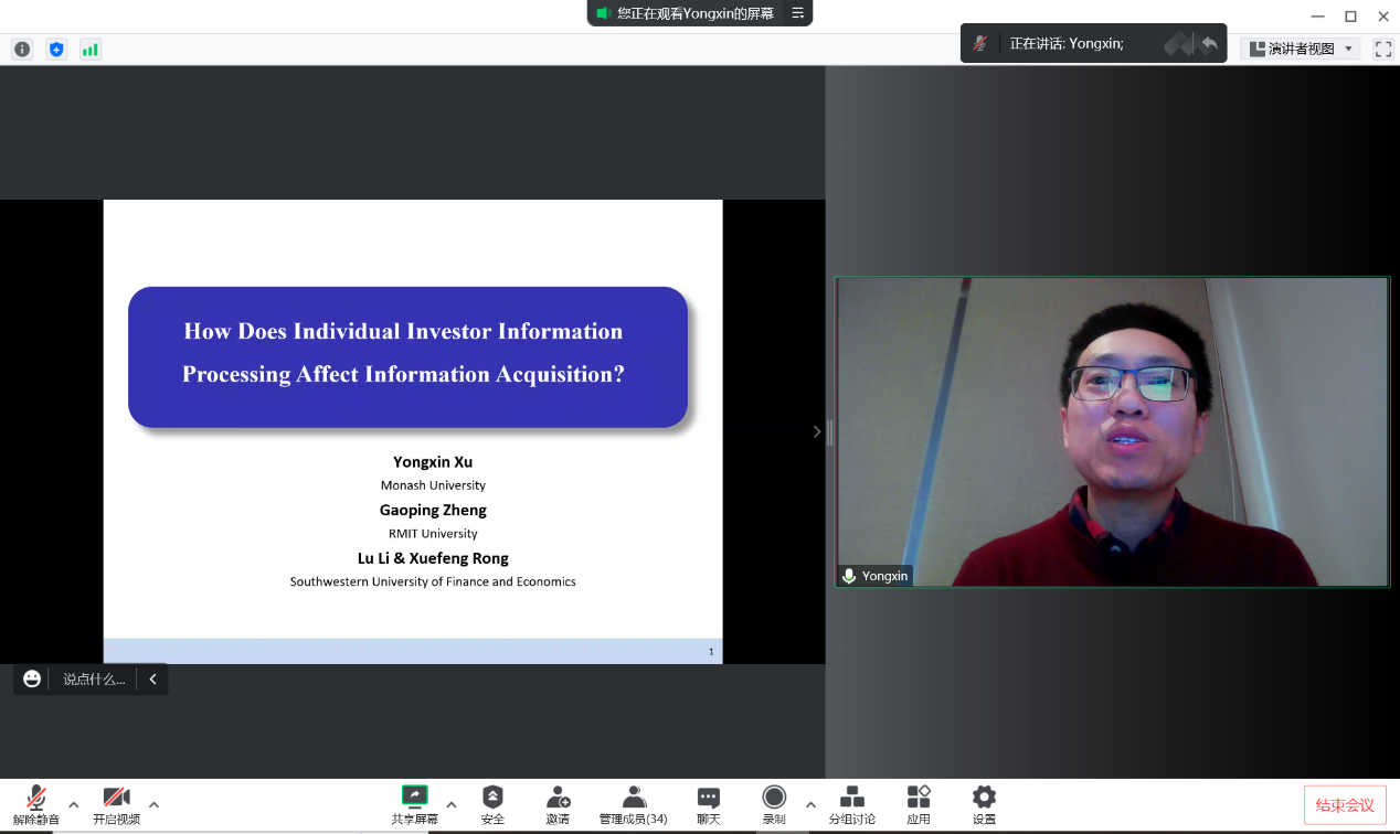 2022年09月27日中午12点,beat365亚洲体育通过线上腾讯会议的方式,举办了2022年第十一期公司卓越学术讲坛。本次讲座邀请了澳大利亚Monash大学Senior Lecturer徐永新博士为主讲嘉宾,包括公司教师、硕博生和本科生在内,共三十余人出席本次活动。