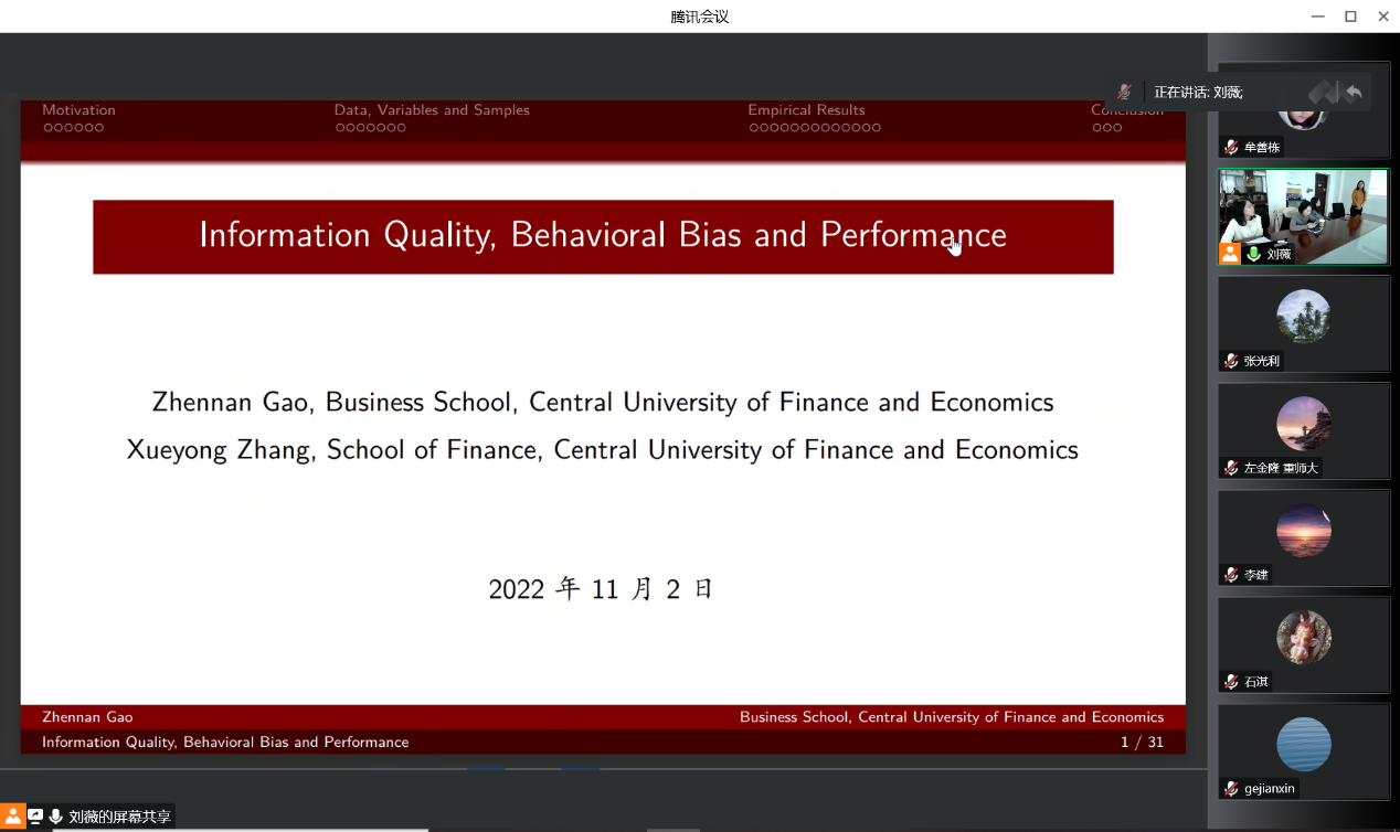 beat365亚洲体育组织与人力资源管理系刘薇副教授主持本次会议,并介绍了高震男博士的履历。高震男博士获得北京大学金融学博士,是beat365亚洲体育助理教授、中国资产管理研究中心研究员。主要研究方向为投资者行为和企业风险管理。在Financial Management, Journal of Portfolio Management等重要期刊发表多篇学术论文,获得Top Paper in Financial Management等学术奖项,主持国家自然科学基金一项。