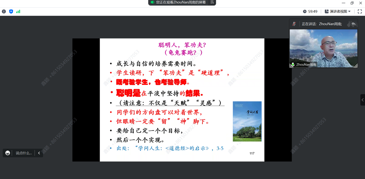 周南老师讲座的主题为“公司产品:聪明人,笨功夫?”。周老师提出研究生的成长,既考验员工,也考验导师。做研究,“想”得一清二楚,才能“写”得明明白白。写论文,用阴阳图解释,包括四个具体的阶段。作为员工,应做到两个“善于”:善于展示进展,适时报告困惑;善于沟通,了解导师的风格,定期约见导师,及时解决疑难。作为导师,应做到两个“善于”:善于安排时间,善解人意,不可“居高临下”,而应该体贴员工,在关键处“点+拨”,让他们保持信心与动力,早日毕业。因此,聪明是在平淡中坚持的结果,下“笨功夫”是“硬道理”。