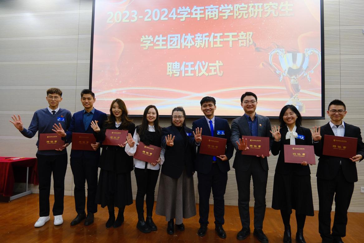 MBA税务俱乐部主席穆阳为秘书长22级汤卫星、执行秘书长23级郑娟、副秘书长23级李风霞、赵桂碧、荣辛、郑苏萍颁发聘书。
