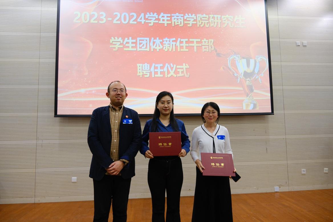MBA员工工作部主任孔伟明、MBA员工会副会长兼秘书长邱滢霏为MBA员工会办公室宣传部部长23级王文娟(P6班),成员于绍强、李晓涵,办公室成员23级左梦媛、张艺璇、库赛雷、王丹妮、石静思、袁建伟、谢英杰、郑娟、牛曼菲、吴天宇、金麒、韩巍、杜望、秦越、李梦雪、王文娟(P7班)颁发聘书。