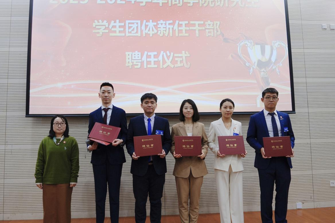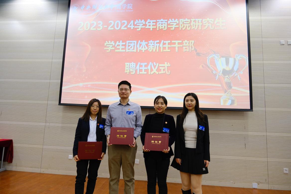 公司党委副书记杨中英为MBA社团协会秘书长郭子瑶、副秘书长陈炼、刘明华、孔一婕、孟庆玮颁发聘任书。