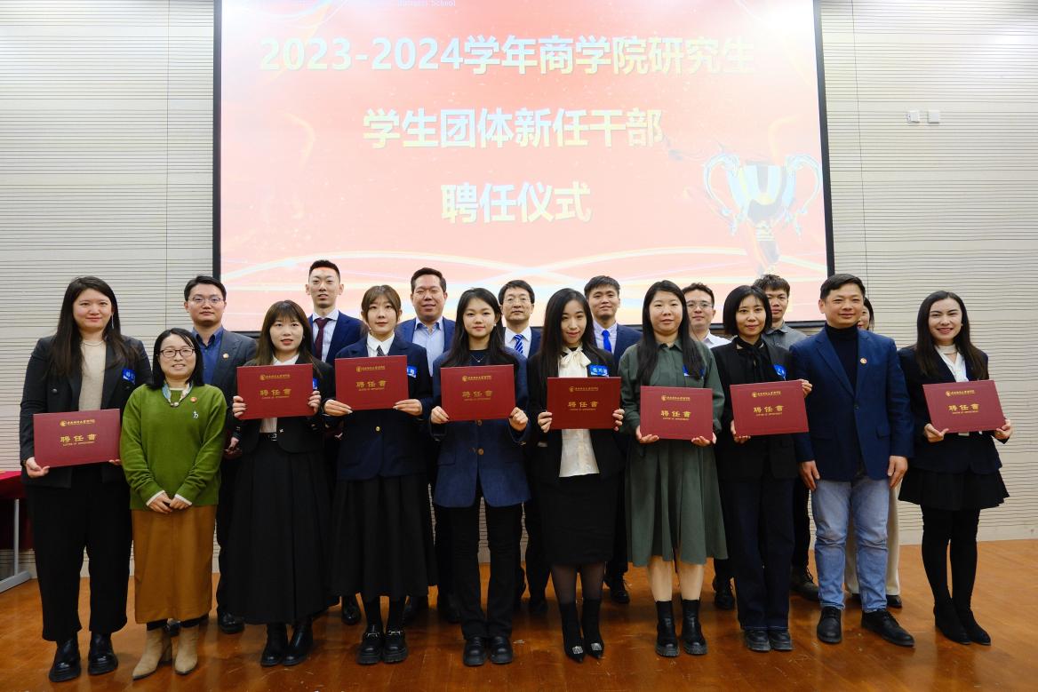 MBA员工工作部刘欣锋老师为房地产俱乐部执行主席22级吴红蕾、秘书长22级王尊、执行秘书长23级孟庆玮、副秘书长23级任茗聪、郑涵之、杨淞严、金麒;执行部长23级胡霖、李超、邵丽娜、张会延、张凯、周玉倩颁发聘书。