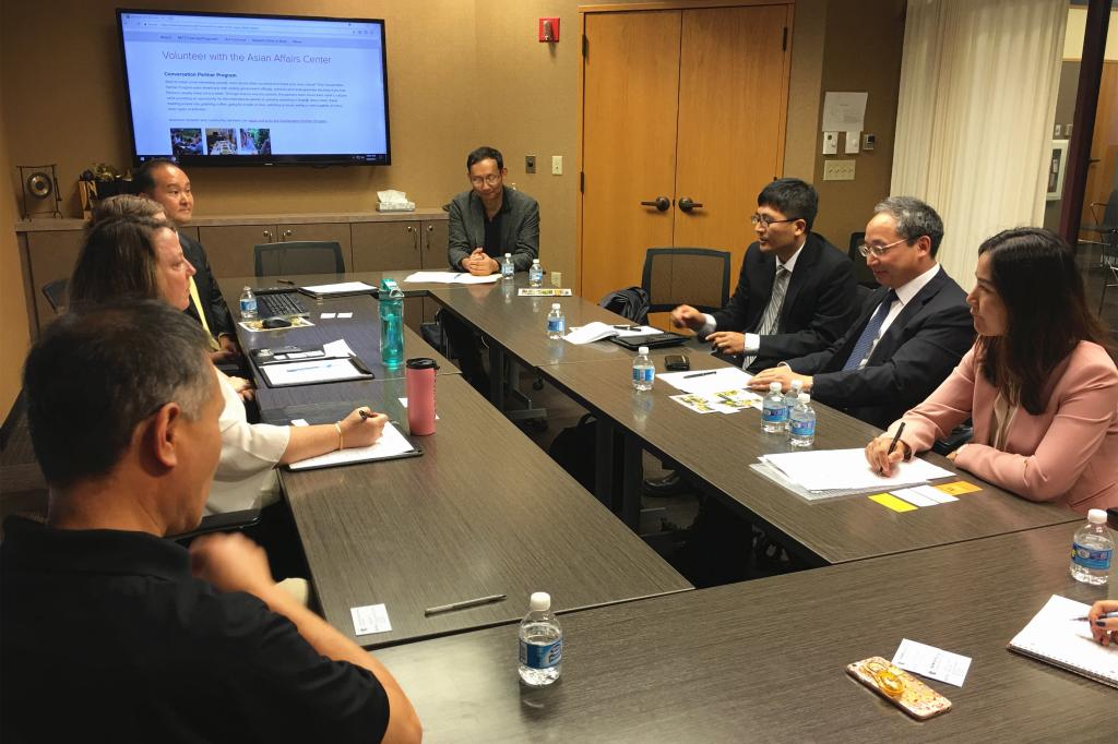 在密苏里大学亚洲事务中心,Sang S.Kim主任以及亚洲事务中心的多位老师介绍了密苏里大学在接收亚洲访问学者,开展员工交换和互访,以及教师培训、管理人员培训等方面的工作情况。双方探讨了开设暑期公司、组织短期课程培训班等多种活动的可行性,并且达成了初步合作意向。