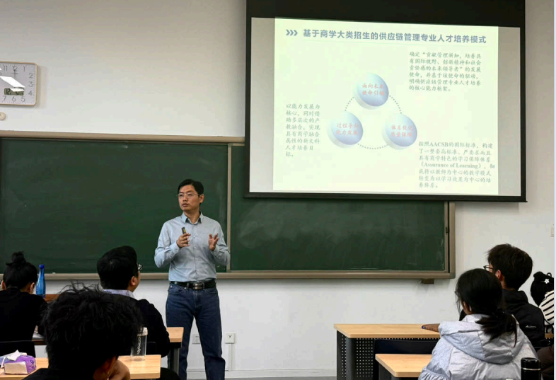 On October 31st, Mr. Mou Shandong, class director of Supply Chain Management-Economic Statistics Dual Degree Program of Class 2024, and Prof. Lu Jizhou from Department of Supply Chain and Operation Management went to Shahe Campus. With the theme of “Into Supply Chain Management: Inventory Management”, Prof. Lu emphasized the importance of inventory management in supply chain management, and explained in detail the application of professional knowledge and real society through vivid enterprise cases.