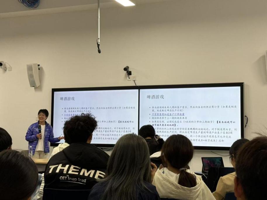 On the afternoon of October 30th, Prof. Mou Shandong, class director of Supply Chain Management-Economic Statistics Dual Degree Program of Class of 2024, Prof. Qian Cheng, head of Department of Supply Chain and Operation Management of Company of Business, and Prof. Qi Yu visited Shahe Campus. With the theme of “Into Supply Chain Management: Interesting Supply Chain Management”, Prof. Qian Cheng started from the development and discipline positioning of supply chain management, and explained the concepts and core areas of supply chain management. Afterwards, Prof. Qian Cheng used a beer game to help everyone deeply understand the bullwhip effect in supply chain management. The beer game also ignited the enthusiasm of the students and pushed the atmosphere of the exchange meeting to the climax.