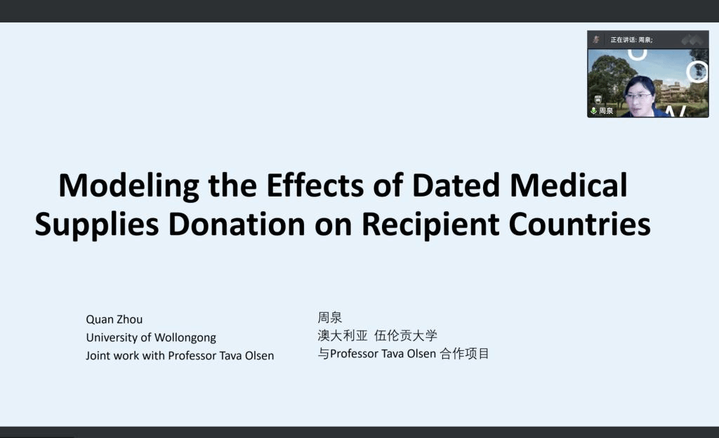 The topic of Dr. Zhou Quan’s lecture is “Modeling the Effects of Dated Medical Supplies Donation on Recipient Countries”. The research focuses on the donation of dated medical supplies. The international community has always been very cautious about such issues, and most of the concerns lie in the macro influence on recipient countries. This research focuses on the donation of personal protective equipment and similar products, because these products have lower risks related to aging and safety. With a given degree of security, this research simulates the incentive problems in the supply chain of donation of medical supplies, and predicts the potential consequences of corruption in these donations and their impact on local industries. The research findings show that the impact of these donations is not monotonically related to the quality of the donations. Thus, the international community is recommended to reconsider its position of prohibiting the donation of dated supplies. In addition, Dr. Zhou Quan shared valuable experience and suggestions on how to publish papers in authoritative journals during the paper submission process.