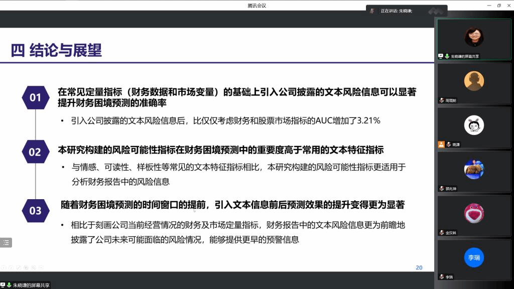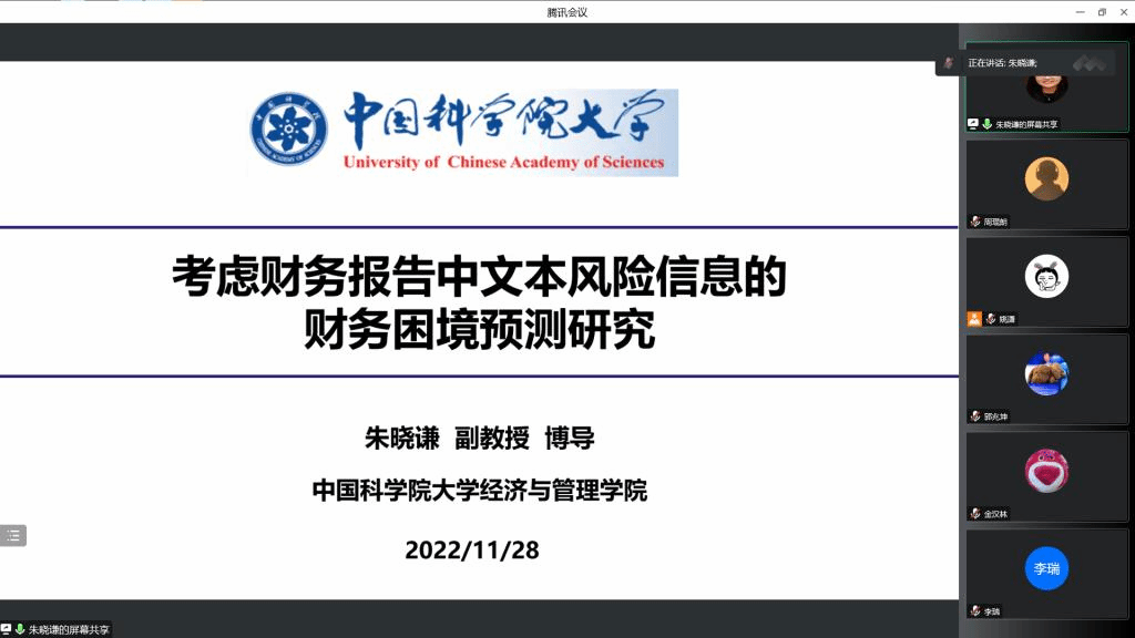 The topic of associate professor Zhu Xiaoqian's lecture is “Research on Financial Distress Prediction Considering Text Risk Information in Financial Reports”. Classical research on financial distress prediction is mostly based on quantitative data such as financial indicators and market indicators. In this research, he innovatively introduces the risk information disclosed in text form in the company's financial reports to conduct financial distress prediction. Besides, he comprehensively mines the key risk information contained in the text from both the expression form and content of the text, and builds a prediction model based on machine learning methods. The empirical results show that integrating textual risk information in financial reports can significantly improve the effect of financial distress prediction of an enterprise. After the report, Dr. Zhu also introduced the contribution information of Journal of International Financial Management and Accounting and Journal of Operational Risk, as well as the special issue information of Emerging Market Review, to help everyone further understand the latest developments of these international journals.