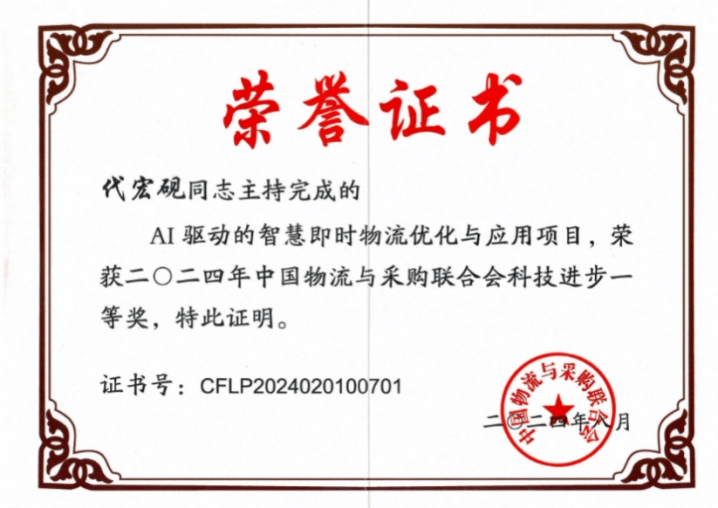 From September 3 to 4, 2024, China Federation of Logistics and Purchasing held the award ceremony of the 2024 Science and Technology Award of China Federation of Logistics and Purchasing at the 2024 Modern Logistics Technology Innovation and Hub Economic Development Conference. This award ceremony was chaired by Professor Dai Hongyan. The project “AI-driven Intelligent Instant Logistics Optimization and Application”, which was completed by Professor Dai Hongyan in collaboration with Professor Zhou Weihua of Zhejiang University, Lecturer Xiao Qin of Jiangxi University of Finance and Economics and Professor Jiang Hai of Tsinghua University, won the first prize of the Science and Technology Progress Award.