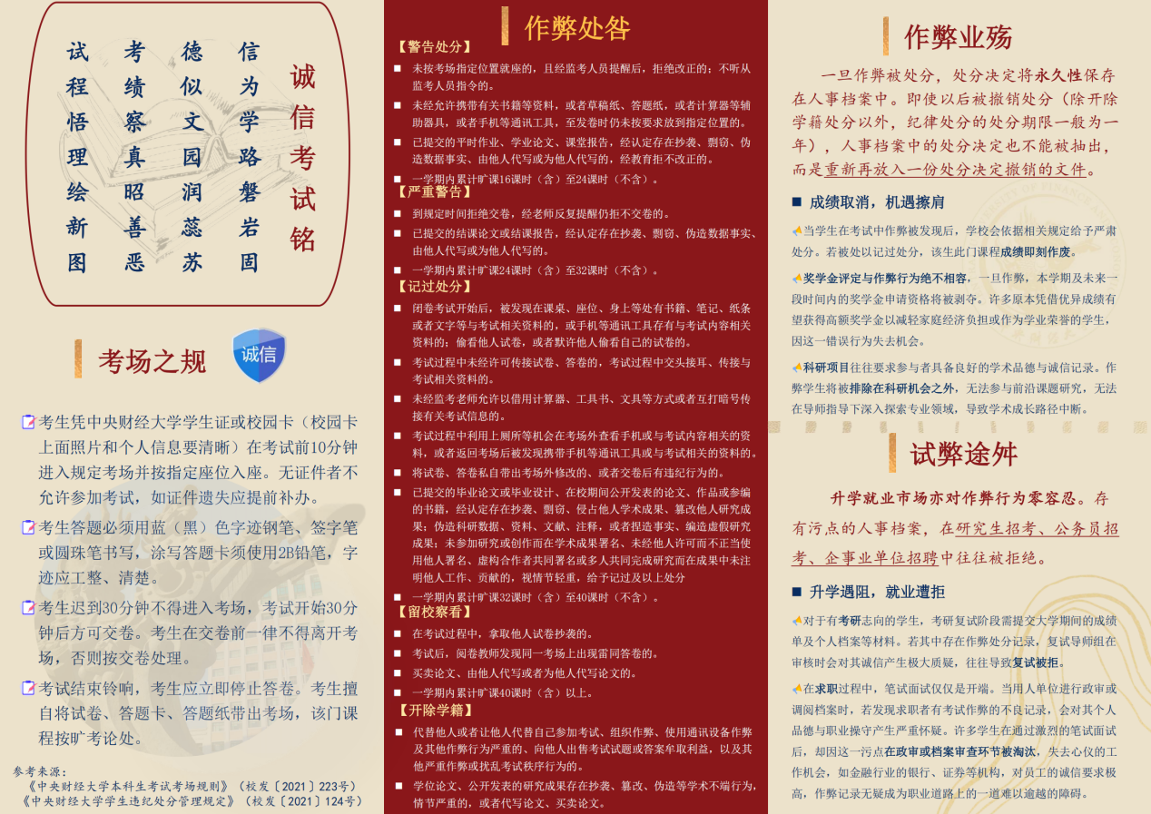 为让大一新生深刻理解学术诚信的重要性,本科生第一党支部精心制作了《公司党支部诚信考试倡议书》折页。这份折页不仅详细阐述了诚信考试的意义,还介绍了学术不端行为的严重后果,着重强调了考试期间应遵守的基本规范。此外,折页中还包含了相关的学习资源、图书馆服务以及考试前的准备工作提示,帮助新生们高效备考,提升自身的综合素质。