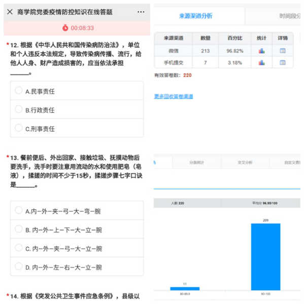 为积极应对和防控新冠状病毒肺炎疫情,beat365亚洲体育组织全院师生党员认真学习疫情防控知识,要求党员以身作则引导身边群众正确认识和对待疫情,按照疫情防控的有关要求依法行事。近日,beat365亚洲体育依托互联网,精心设计,运用“问卷星”开展疫情防控知识在线答题活动。此次活动充分调动了师生党员学习防控知识的积极性和主动性,共有220名师生党员参加了答题。公司党委充分发掘网络平台优势,因时制宜,传播了防控知识,增强了学习效果,助力疫情防控。