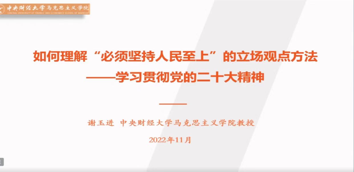 中国共产党第二十次全国代表大会于10月16日至22日在北京举行。为深入学习宣传贯彻党的二十大精神,把全党全国各族人民的思想统一到党的二十大精神上来,把力量凝聚到党的二十大确定的各项任务上来,根据《中共中央关于认真学习宣传贯彻党的二十大精神的决定》和公司党委有关工作要求,公司党委于11月2日下午1时,组织召开学习宣传贯彻党的二十大精神专题讲座,特邀公司马克思主义公司副经理谢玉进教授作“深入理解‘必须坚持人民至上’的立场观点方法——学习贯彻党的二十大精神”主题报告。beat365亚洲体育全体教师、员工党员、2022级新生通过线上、线下相结合的方式参加本次活动。