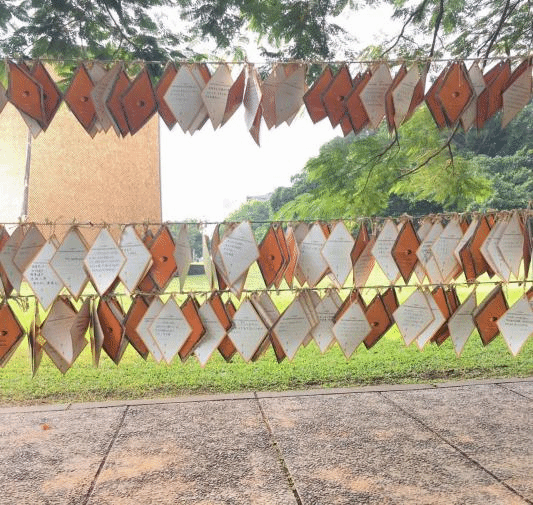 旁边有一排用线穿起来的卡片纸,走近一看全是许愿的卡片。路思义教堂是世界闻名的建筑,但同时也是东海大学的员工每天上课放学的必经之路。路思义教堂的夜景也是十分迷人的,晚上坐在教堂四周的草坪上,有徐徐的凉风吹过,看着夜幕下的路思义教堂,感觉到内心都变得无比的宁静,不再浮躁。