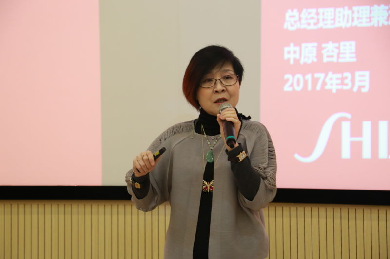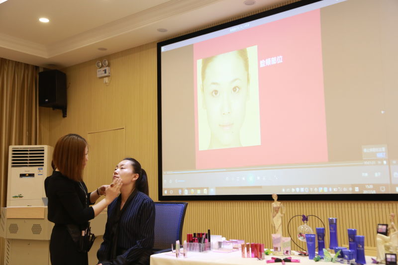 中原杏里女士简单介绍了资生堂的品牌后,重点为在座教工讲解了女性如何根据自身特质和优势进行化妆,特别是针对教师这个职业的化妆要求,以在讲台上向员工展示出自己最美的一面。