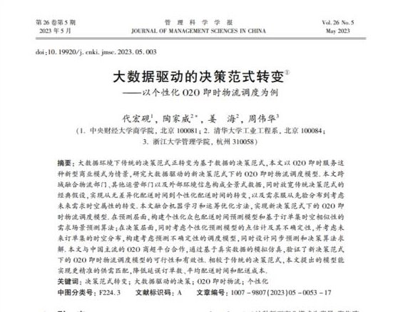 近日,公司代宏砚教授与清华大学陶家威博士、清华大学姜海教授及浙江大学周伟华教授合作撰写的《大数据驱动的决策范式转变——以个性化O2O即时物流调度为例》在权威学术期刊《管理科学学报》发表。