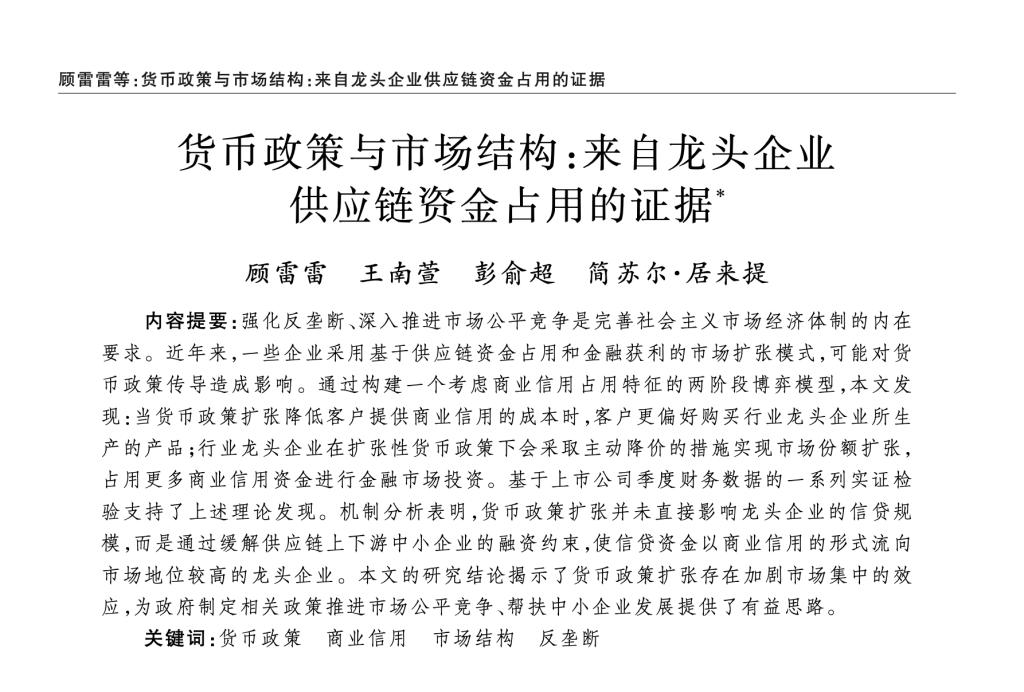 该论文构建了一个考虑商业信用占用特征的两阶段博弈模型,发现:当货币政策扩张降低客户提供商业信用的成本时,客户更偏好购买行业龙头企业所生产的产品;行业龙头企业在扩张性货币政策下会采取主动降价的措施实现市场份额扩张,占用更多商业信用资金进行金融市场投资。基于上市公司季度财务数据的一系列实证检验支持了上述理论发现。机制分析表明,货币政策扩张并未直接影响龙头企业的信贷规模,而是通过缓解供应链上下游中小企业的融资约束,使信贷资金以商业信用的形式流向市场地位较高的龙头企业。本文的研究结论揭示了货币政策扩张存在加剧市场集中的效应,为政府制定相关政策推进市场公平竞争、帮扶中小企业发展提供了有益思路。